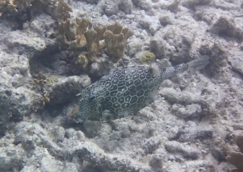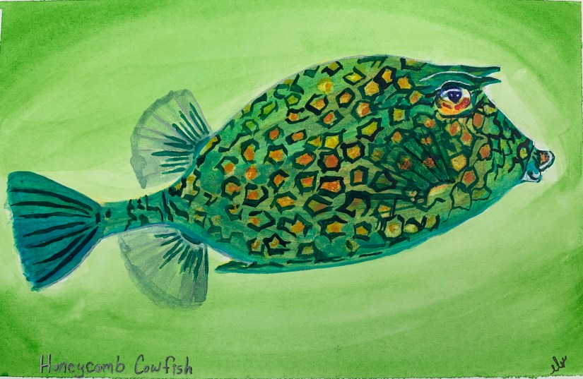 These fish are tricky to photograph but really fun to paint! To photograph them, you really have to wait for them to come to you. This was an early favorite fish of mine – the colors are so beautiful and the horns on its head are really fun to see! Though I didn’t realize until I started working on this post that there are spines on their underside as well. Even though I actually included them in my watercolor painting, I thought it was part of their fins. You can just make out the spines in a few of the pictures below.