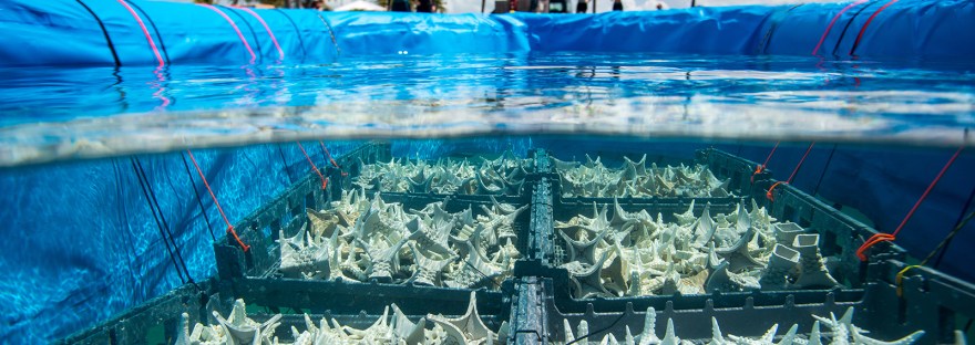 Gametes are collected using their coral germ cell collecting devices, the coral larvae settle on the coral settlement substrate, and then they are sheltered and protected in floating basins called Coral Rearing In-Situ Basins (CRIB) aka coral kindergartens.