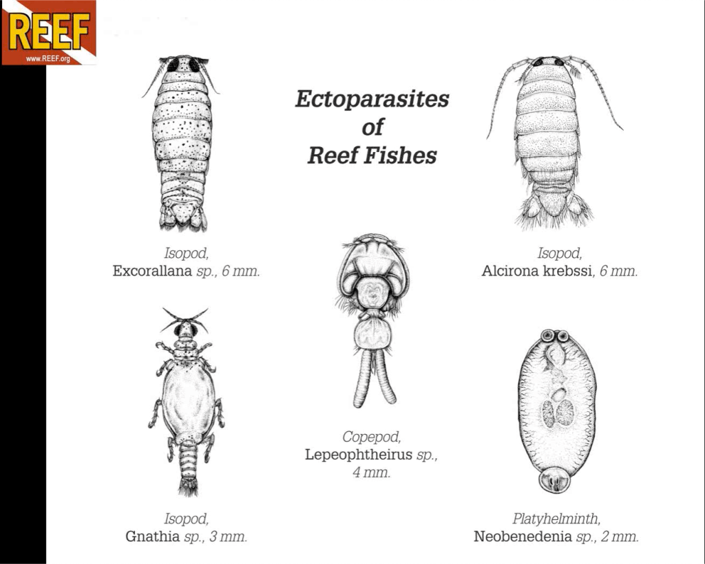 Below is a diagram of the most common ecto (external) parasites that will attach themselves to fish and drink their hosts’ blood. Fish come to cleaning stations to get these parasites removed by small fish. If you are very patient and still, you can see the tiny cleaners darting in and out of the mouths and under the operculum (gill covering) of larger fish and eels to get at the parasites lodged in the soft, blood-rich tissues of the gills.