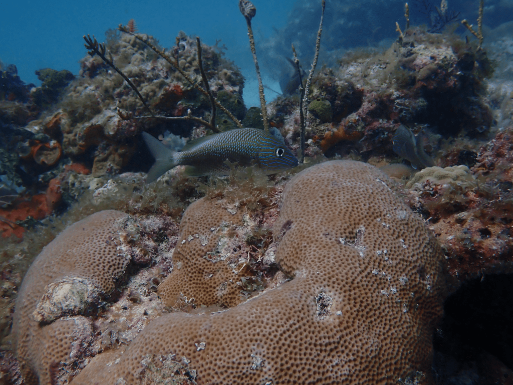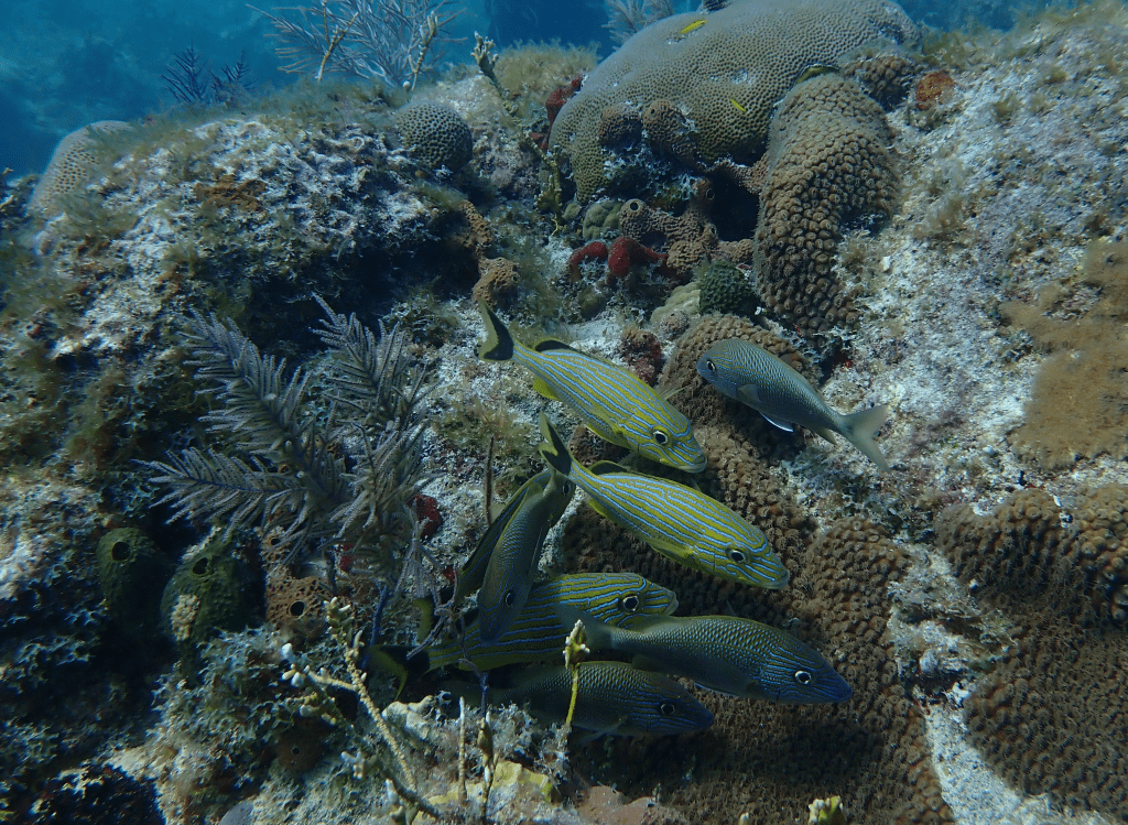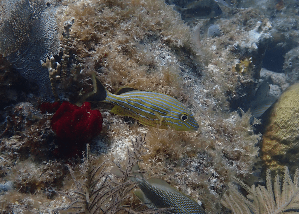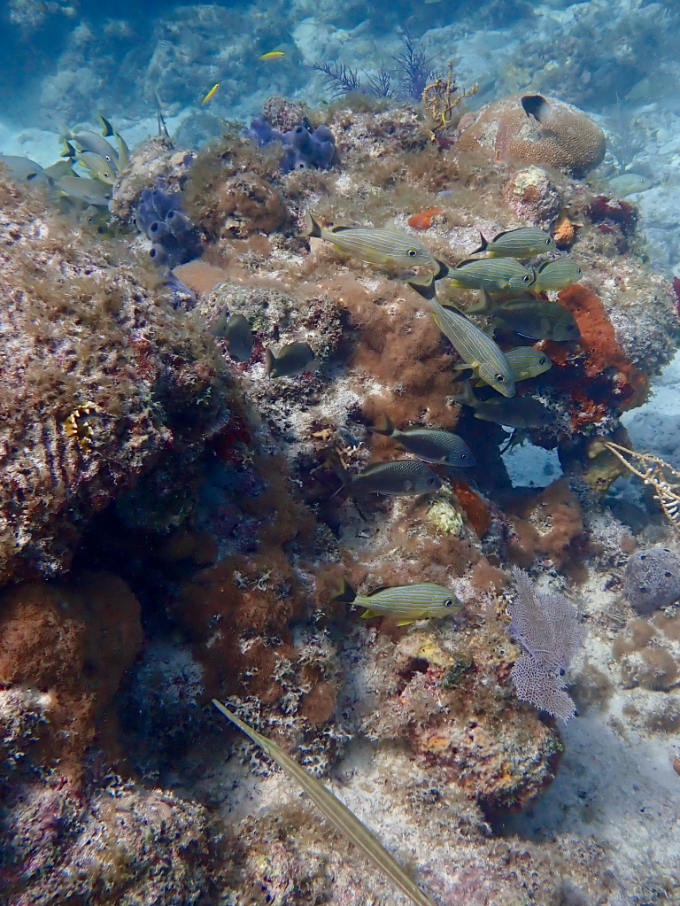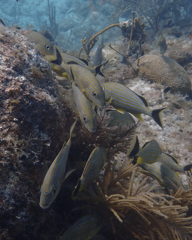 These two photos are my absolute favorites from the trip – maybe not my best photography to date – I wish I gotten a slightly better angle on the first and better lighting on the second, but it captures some really interesting fish behavior. These two Blue Striped Grunts are pushing against one another with their mouths open. It is thought to be a behavior related to territory or mating, but the exact purpose isn’t known.