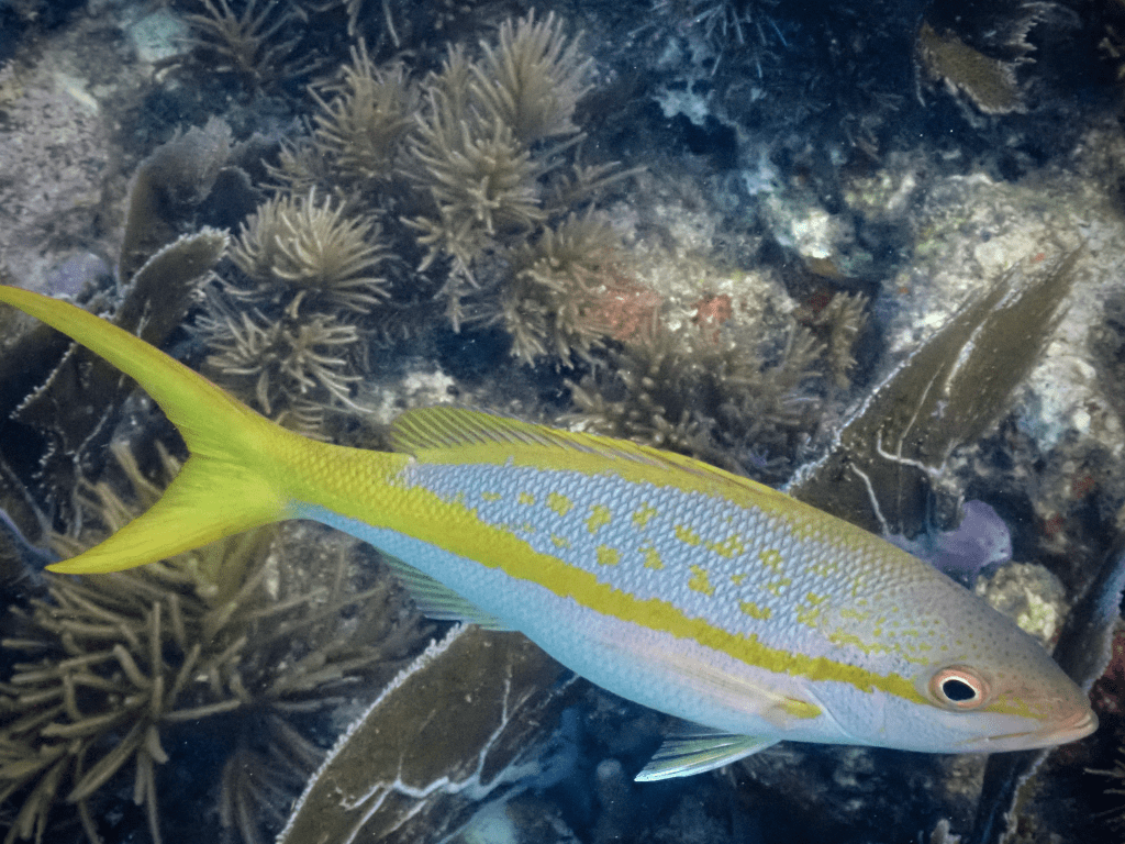 However, the snapper you are most likely to see is the Yellowtail Snapper which is easy to identify because of their bright yellow strip along their body and tail. They also have a curious nature and are likely to swim close to you while snorkeling.