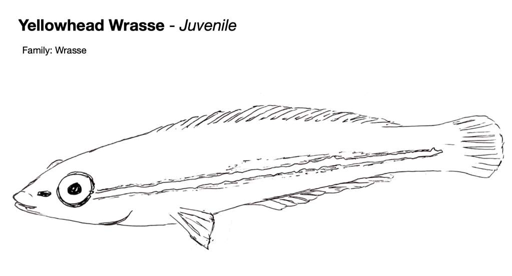 When they are young (juveniles) Yellowhead and Bluehead wrasse play a very important role on the reef – they are cleaner fish who help keep all the other fish clean and healthy. This works out great for everyone – the big fish get all the itchy uncomfortable parasites off of them and the juvenile wrasse get to eat all the juicy, tasty parasites.
