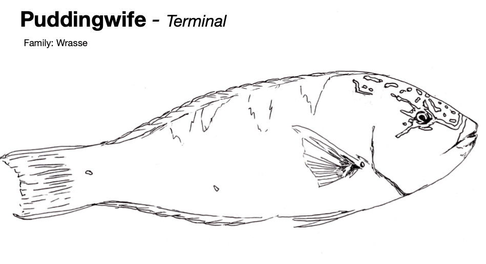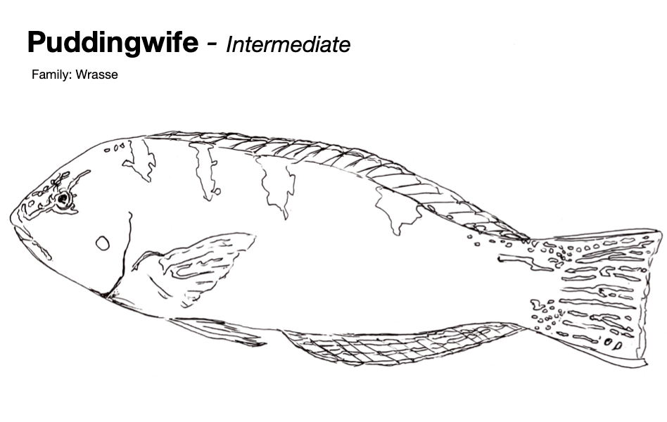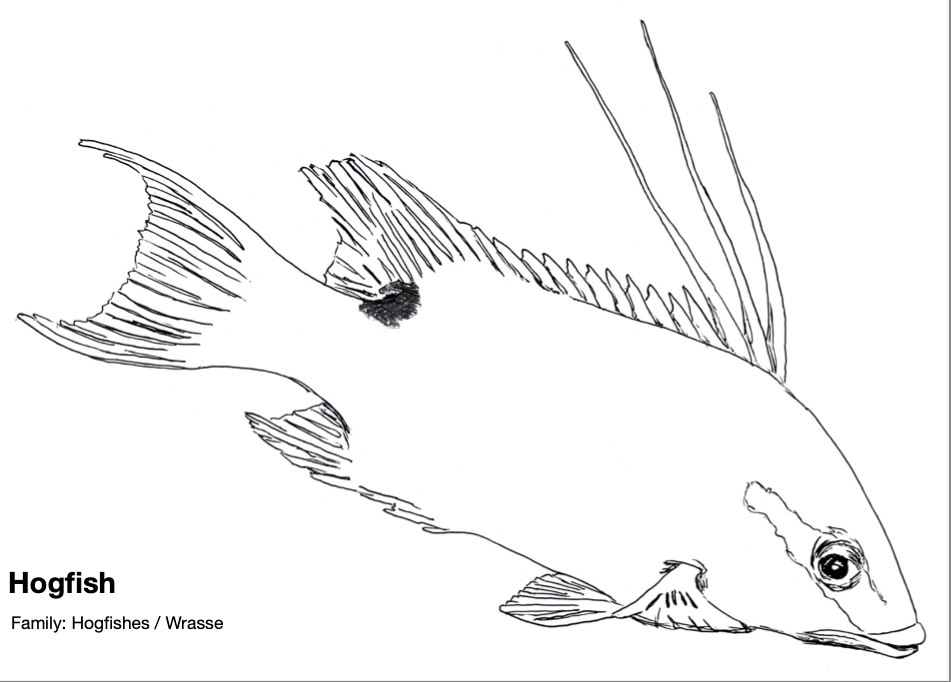 No fish coloring book could be complete without a substantial section on the Wrasse family. These fish are common, plentiful, often brightly colored, and ecologically significant – an all around win for snorkeling and coloring! I’ve included the most common wrasses – Yellow and Blue headed Wrasses and Hogshead Wrasse – as well as the rarer but fantastically colored Puddingwife wrasse.