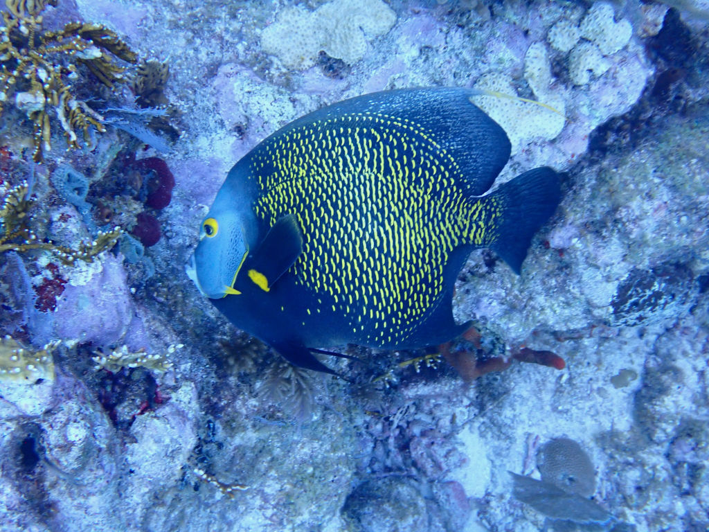 More than once, I have had the amazing experience of a large French Angelfish swimming up to me. One time, it swam so close up to my face, it almost looked like the fish wanted to check its reflection in my mask. They are such calm fish, I’m always delighted when I spot a French Angelfish. They have this funny habit of swimming on their side and calmly looking up at you while nibbling on algae.
