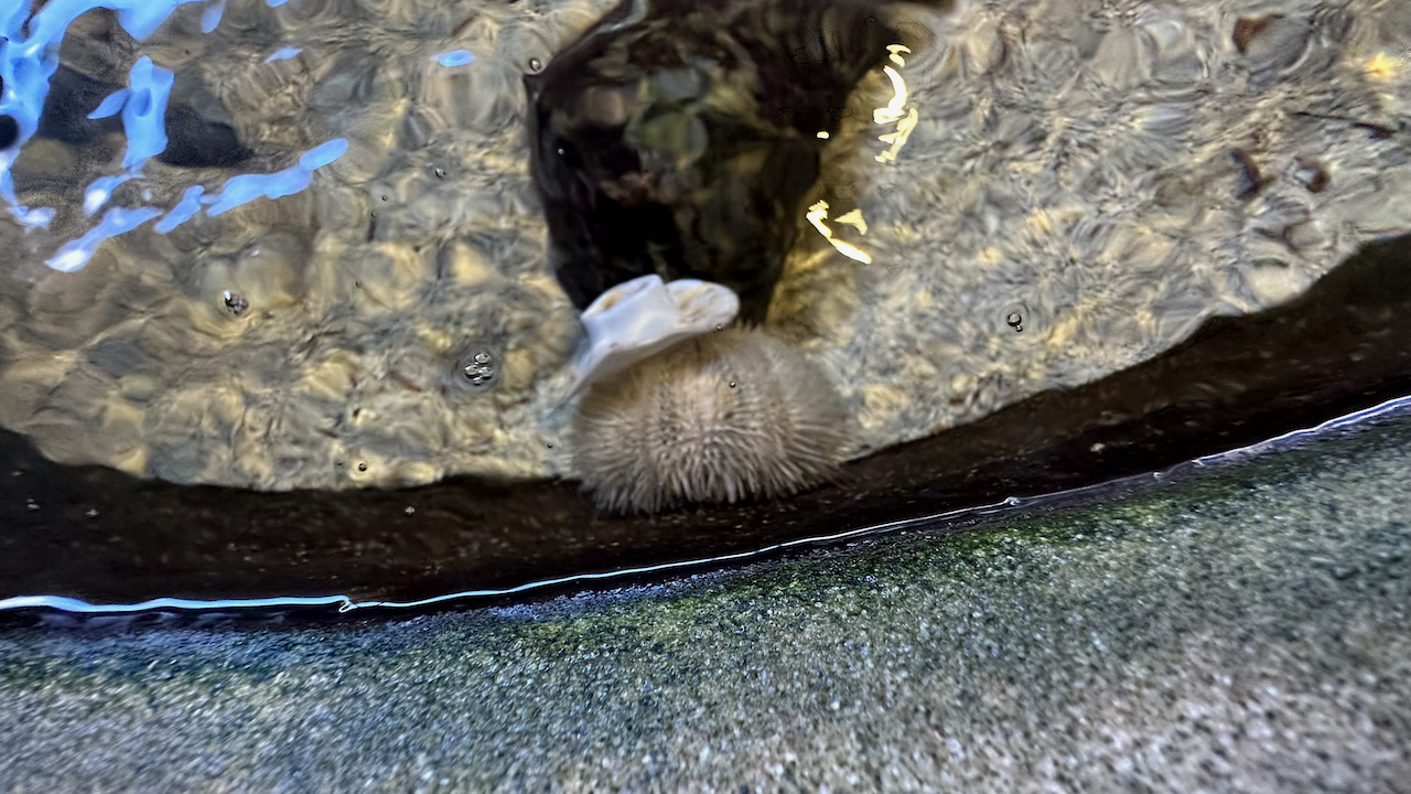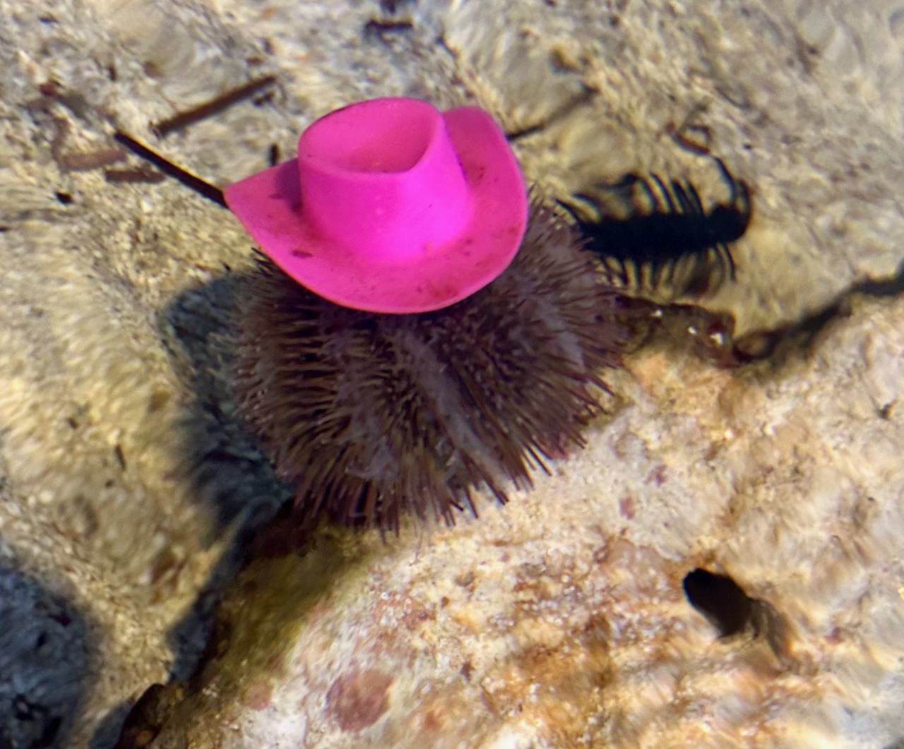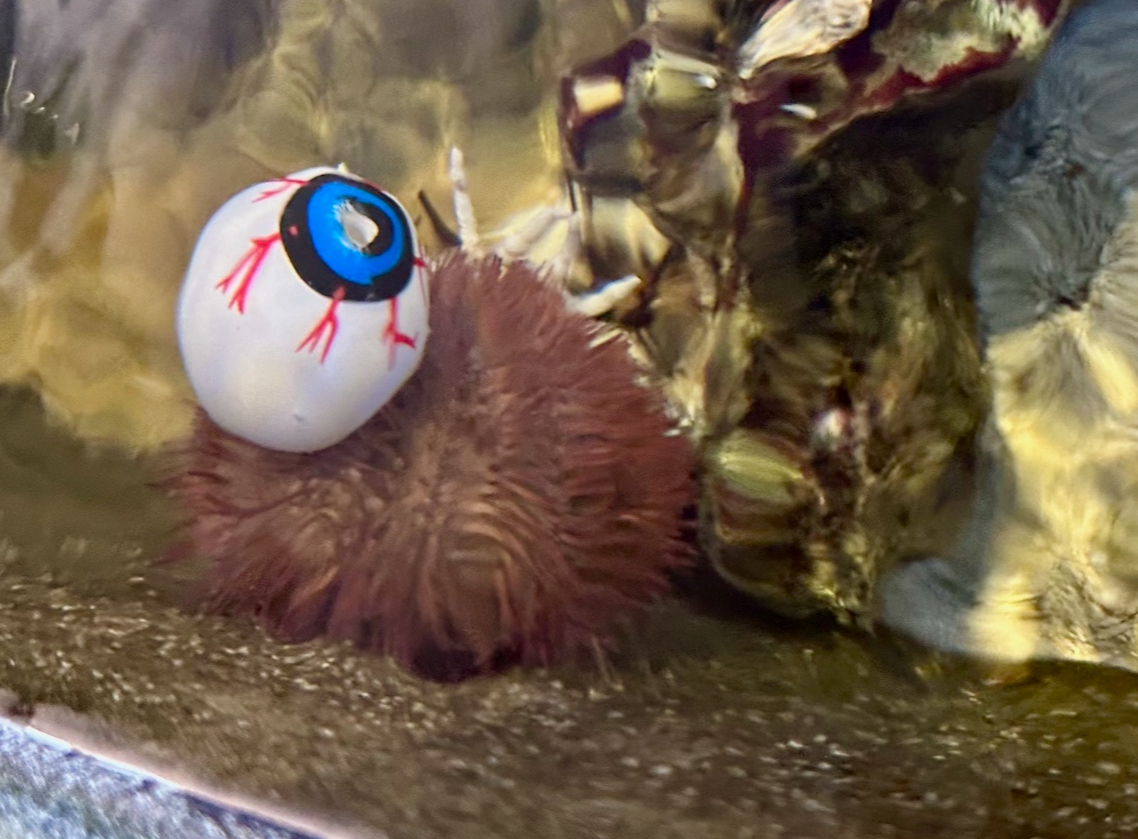 Everyone loves dressing up for Halloween, even the urchins! At Contact Cove, the variegated urchins get little plastic cowboy hats and huge goofy eyeballs to wear. It is hilarious and adorable, but it also encompasses an important behavior trait of these urchins. They like to cover themselves in debris they find in their habitat.
