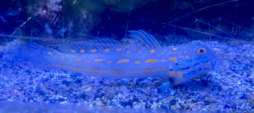 I regularly confuse gobies and blennies, so when I saw this amazing fish at Mote recently, I decided it was time to memorize their ID characteristics. I’m also excited learn a bit more about this goby. Although the image above isn’t the best, you can clearly see there are two distinct dorsal fins and it’s body position is straight and fairly stiff (p. 270, Humann, Deloach, 2016).