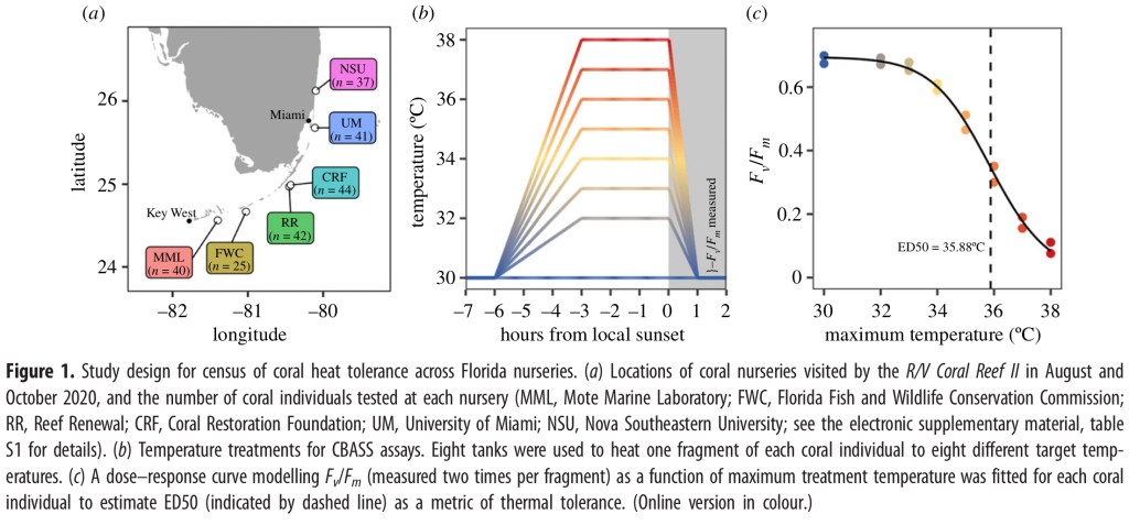 In this study, samples were taken from six coral nurseries that spanned the southern coast region of Florida that makes up the Florida Coral Reef (figure 1a) and “represent an ideal population in which to quantify variation in thermal tolerance owing to coral genotype, because corals are common gardened in each nursery environment, and associate with the same algal symbiont species (Symbiodinium ‘fitti’) across this gradient.2 In this context, common garden refers to the fact the corals present in the nurseries represented “species or populations collected from multiple distinct geographic locations, grown together under shared conditions”. 3