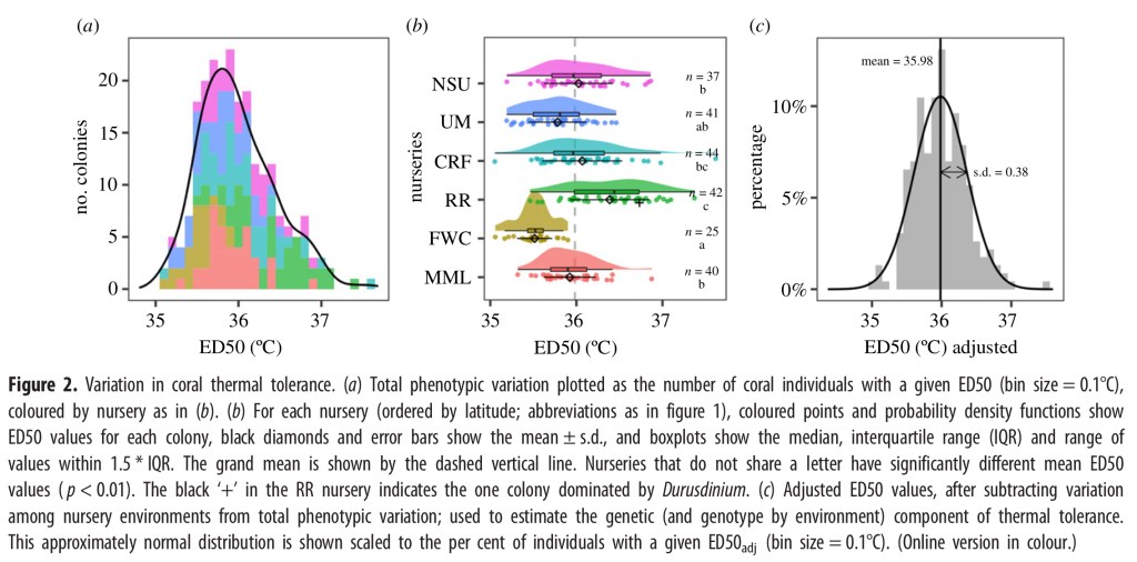 The image below illustrates the variation in coral thermal tolerance data. Figure 2a shows the total phenotypic variation plotted as the number of coral individuals with a given ED50 grouped in 0.1°C increments and coloured by nursery. Overall, the curve is roughly normal with a slight skew to the right showing a greater number of individuals with a higher thermal tolerance.