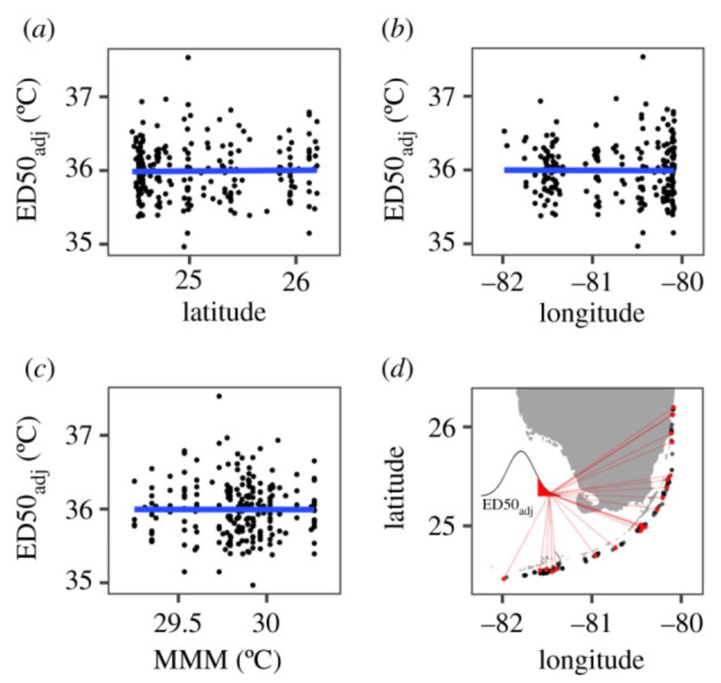 The image below shows the results of this test. The blue line represents the linear model fit, none of which were significantly different from zero indicating that the phenotypes with higher thermal tolerance in the CBASS tests were likely not a result of source location.