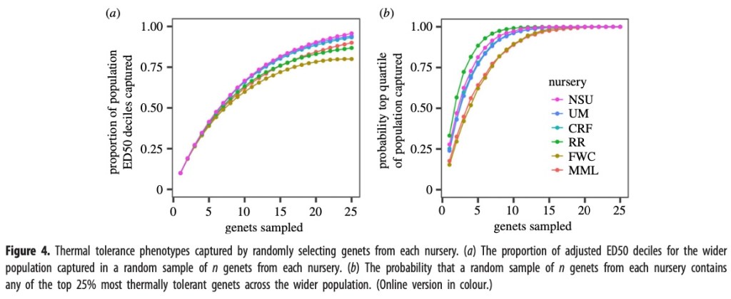 Using the data from these experiments, researchers determined that, in order for a sample of coral genets taken from a nursery to capture at least 50% of the thermal tolerance range, they would need to randomly select 7 to 8 coral genets. In order to have a greater than 90% probability of capturing at least one thermally tolerant coral in the sampleset, 6 to 7 coral need to be sampled from Reef Renewal, University of Miami, Nova Southeastern University or Coral Restoration Foundation or 11 genets from Mote Marine Laboratory and Florida Wildlife Commission. Figure four b illustrates this sample selection rate below.
