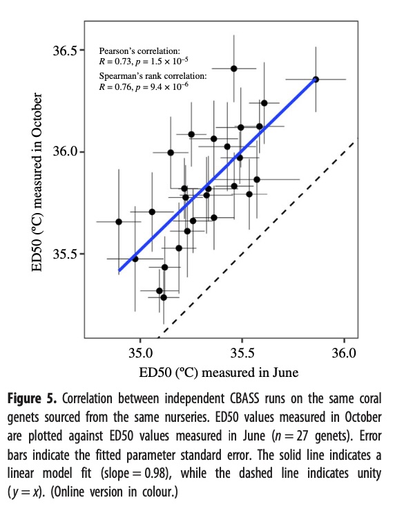 To verify the reproducibility of these experiments, 27 genets from the same nurseries tested in October were also tested in an independent set of CBASS experiments in June of the same year. The results showed a strong, positive linear relationship between the two independent experiments. Though, it was noted that the ED50 values measured in October averaged 0.51°C higher than values measured in June. The image below illustrates this data.